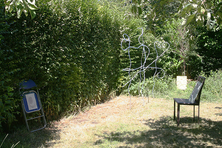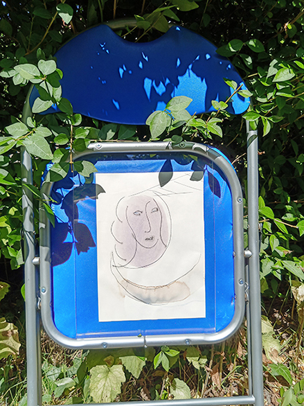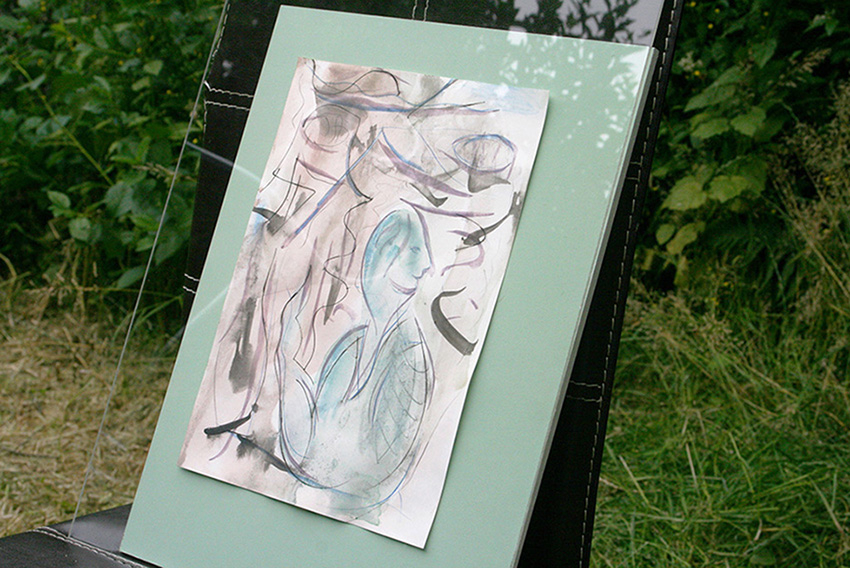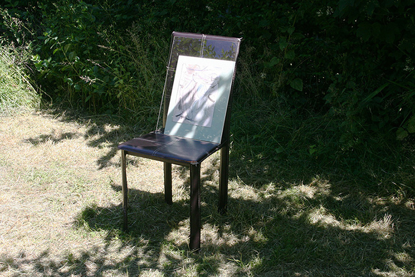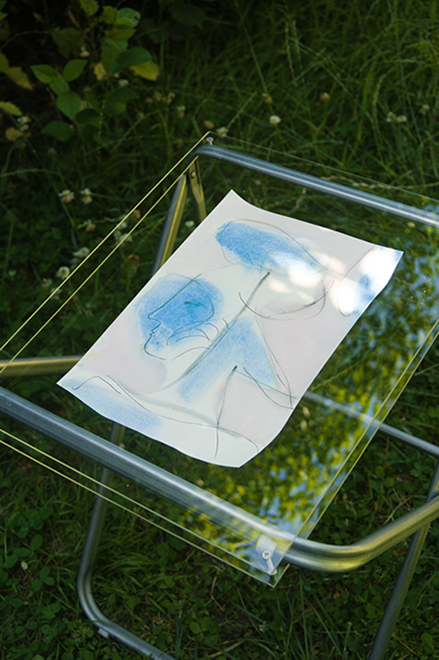 K_O-2, 2019. Tea, fineliner on paper, plexiglas, chair, 80 x 40 cm